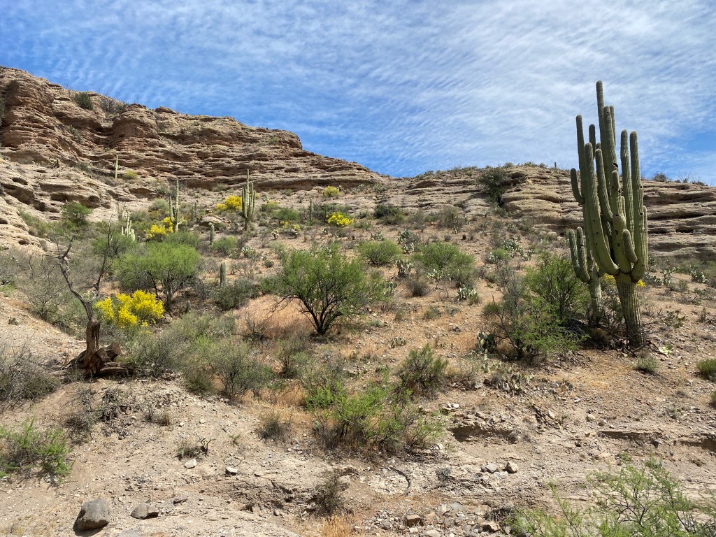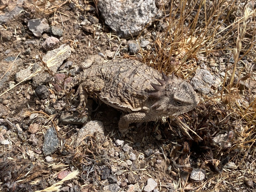 Shortly after the tank, we dropped into an open canyon with layered sandstone walls, saguaro dotted with bird homes, and brilliant yellow brush. Beans spotted a lizard and I identified it as a Regal Horned lizard. I was excited to observe a new variety, having never seen one with its spiky ruff.