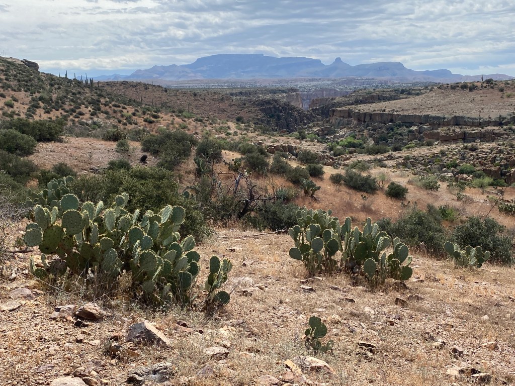 The afternoon took us along dirt roads followed by a couple mile bushwhack down into and out of Horse Camp Canyon, where the trickiest part was picking our way through a forest of Prickly Pear cactus. We passed a series of giant stock ponds and decided to camp at the third one, Double Tank. It had a nicer shoreline than the previous tank, which meant easier water scooping access. We gathered water and set up camp as darkness fell. The full moon was beautiful as it hung low in the sky. Birds and Beans cowboy camped while I set up my tent. I could feel moisture building in the air and knew that I would sleep better inside. My first full day and we covered with 4,000+ ft. gain.
