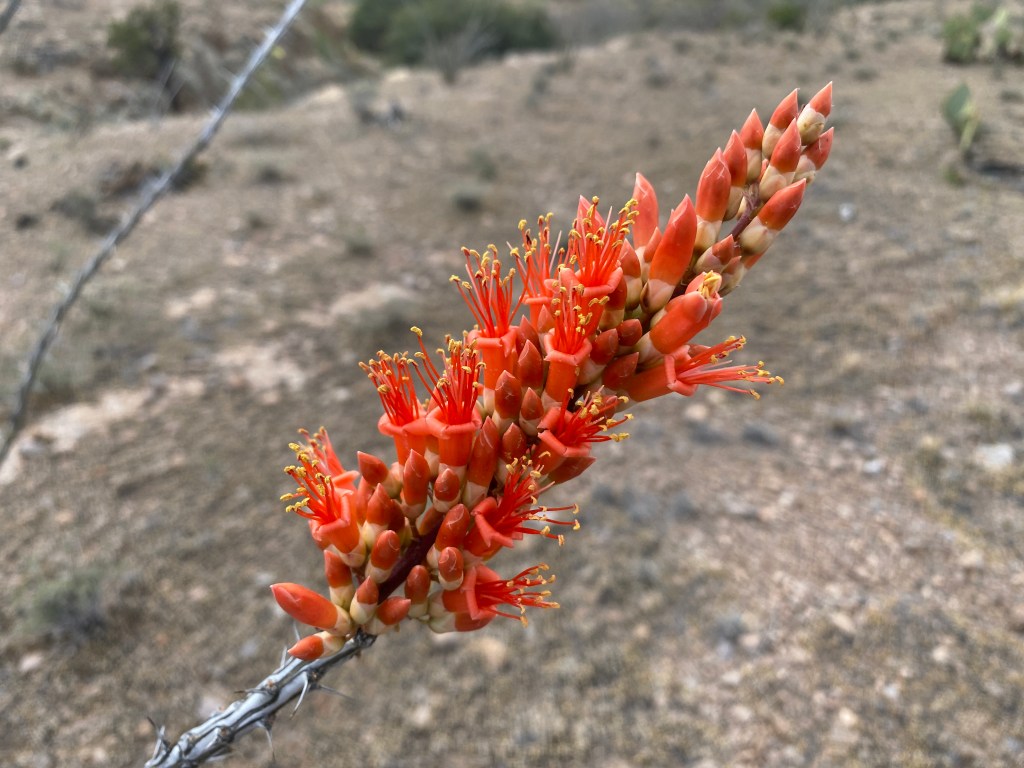 Our morning route led us along a faint, two-track dirt road that slowly ascended. At one point, from under a bush, a large Western Diamondback snake warned us with its rattle. My first snake of the trail, yay! The Ocotillo were tipped with beautiful red blooms. The sky was overcast and the temperature perfect for a steady climb. Eventually a medium rainfall began and we used our Gossamer Gear sun umbrellas for protection. They worked well, though after a time we stopped to put on rain jackets. Our feet grew heavy from the mud of the road. The other gals, having walked a week through a heat wave, truly appreciated the desert rain.
