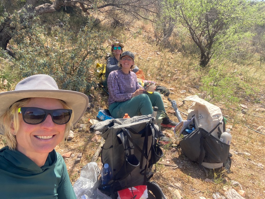 A bit past noon, we took a side trip to an old homestead built into a natural rocky crevice. One end, where the rock curved down to meet the ground, looked like a hobbit’s home. Inside we found a few pictographs etched into the soot-covered, stone roof. At 2 pm, we took a second side trip, walking across desert mesa to a viewpoint of Aravaipa Canyon’s upper reaches. While Bird and Beans ate their lunch, I finished off mine.