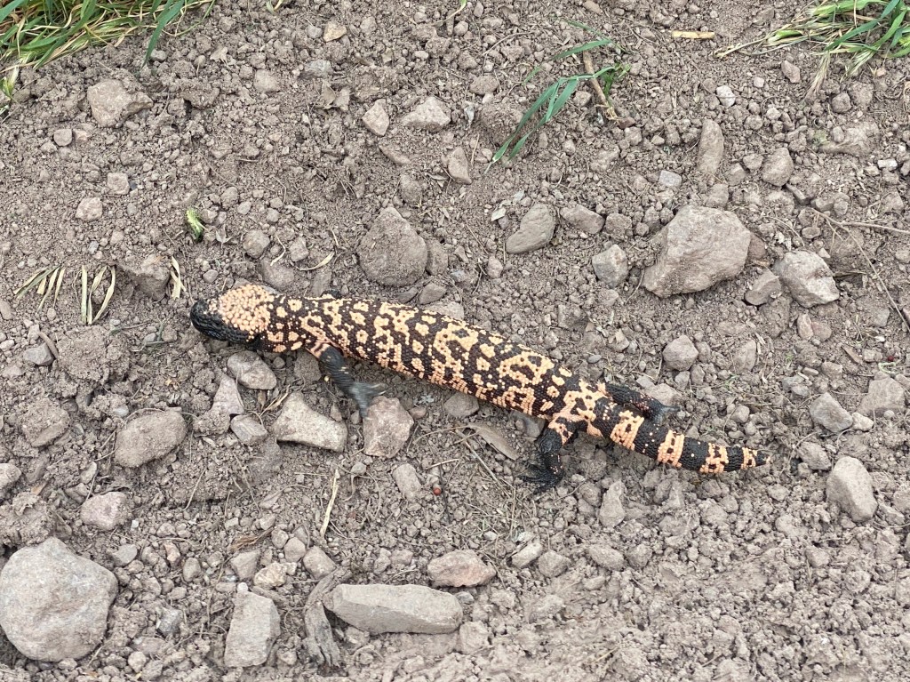 Shortly after the eastern Aravaipa TH, we were walking along the canyon, wide and tree lined, when I spotted what I thought was a Gila Monster. I eagerly ran towards it and it was indeed a colorful Gila Monster, maybe a foot or so long. I was so excited! It was the critter I most wanted to see on this trail and it already happened! The lizard was not too concerned by my presence, it flicked its tongue a couple times then casually climbed the bank and slid over the lower wire of a fence and into the grass beyond.