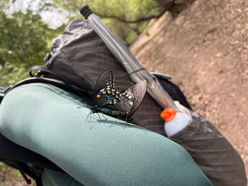 A series of critter encounters came in short succession. First, I found a brilliant blue butterfly submerged in a pond. Then a one foot snake rattled at us and turned out to be a Prairie Rattlesnake, another new species for me! Shortly after, Thorn and I were examining a lizard that looked possibly smooshed. She prodded it with her pole and it startled us into laughter when it skittered off.