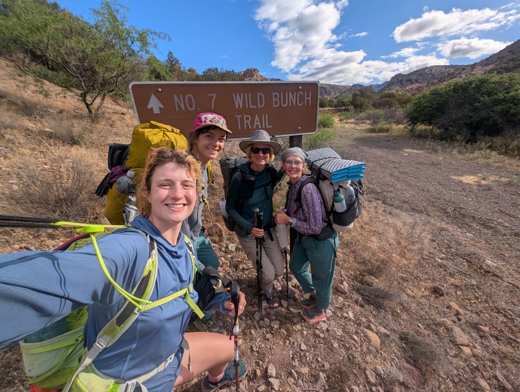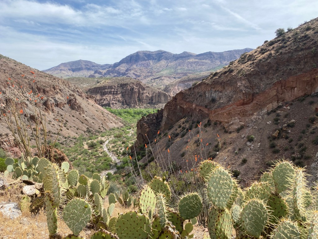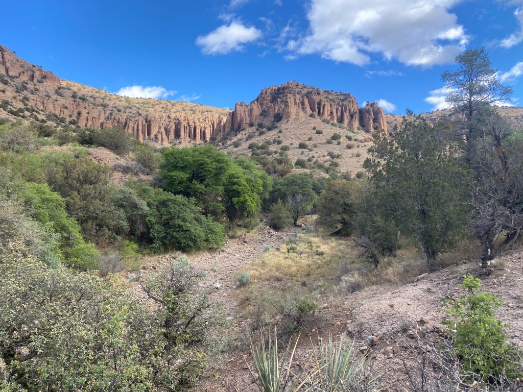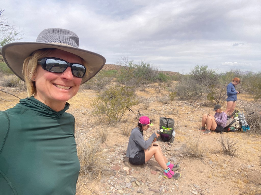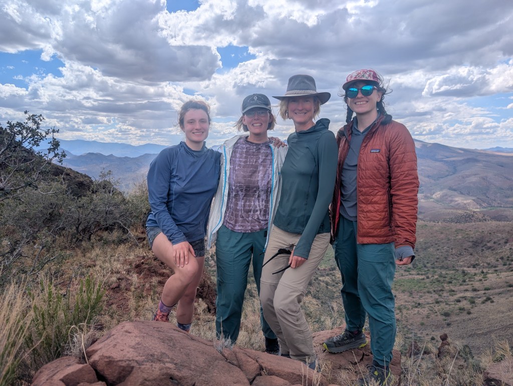 The canyon ended at a confluence with a couple others, the flat space between filled with trees and the strong flow of Bonita Creek. Bird threw a large log into the creek and we crossed it. Soon we entered Midnight Canyon, which had a couple narrow spots roofed by wedged, giant boulders. We exited the canyon on a 4WD drive road and began to climb. There was a loud, distant boom. Thorn spotted a smoke plume and we figured it was likely an intentional explosion at the copper mine. We climbed ~2,000 ft. to Bellmeyer Saddle, where we ate lunch. Bird is unabashedly slower on climbs. She got a shorter lunch than the rest of us.
