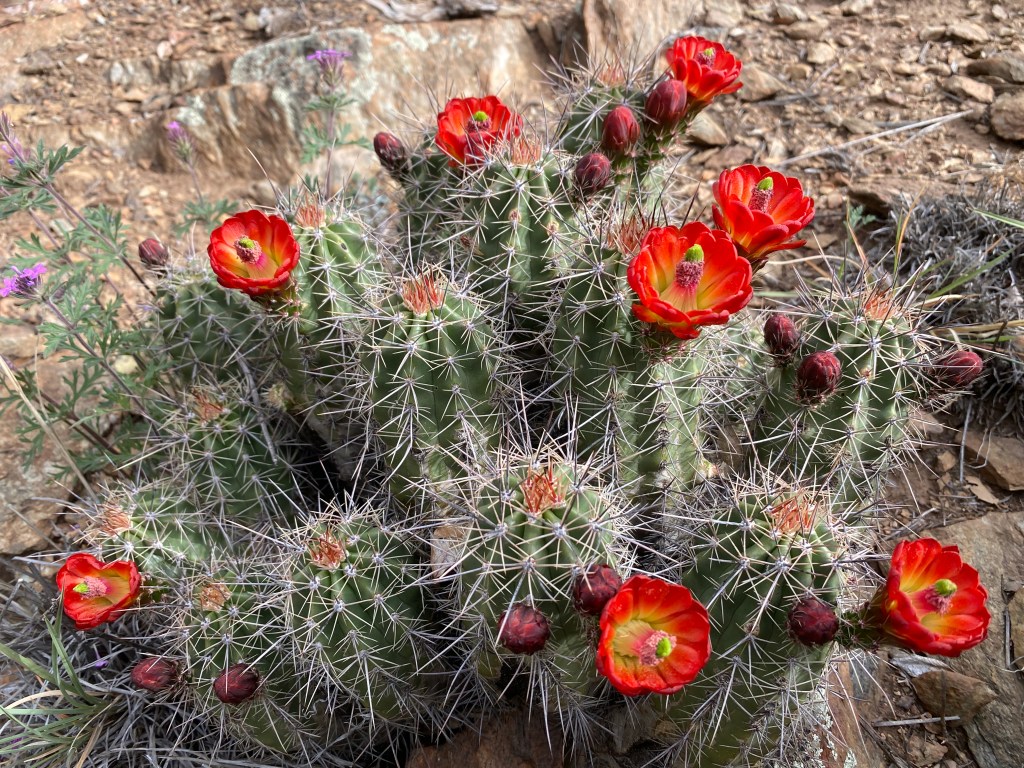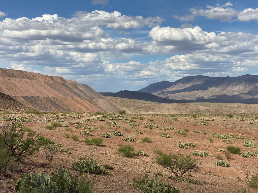 The rest of the day was dirt road walking. Post lunch, the road climbed and it was warm, though not hot. Bird became nauseous and we took several rest breaks to help her recover. None of us minded, that’s why we’re hiking together after all, for company and to be there for one another. One rest break took place within sight of an active copper mine’s tailings. I found them scenic, set amongst prickly pear and mountains. The GET formerly traveled through the mine’s location.