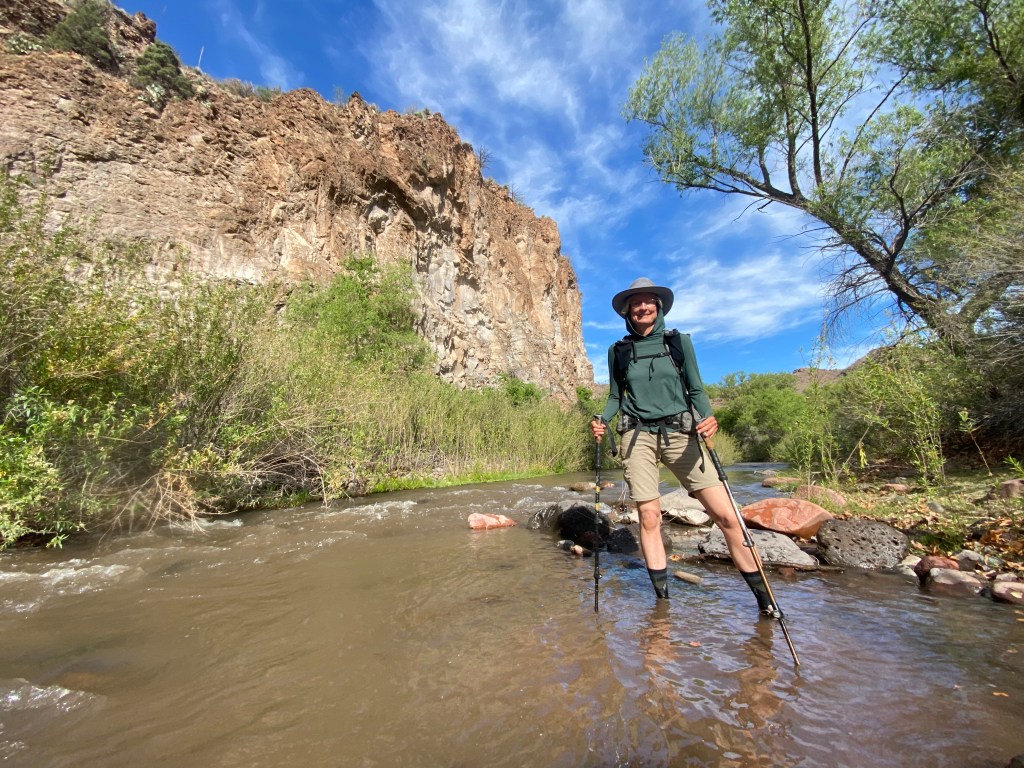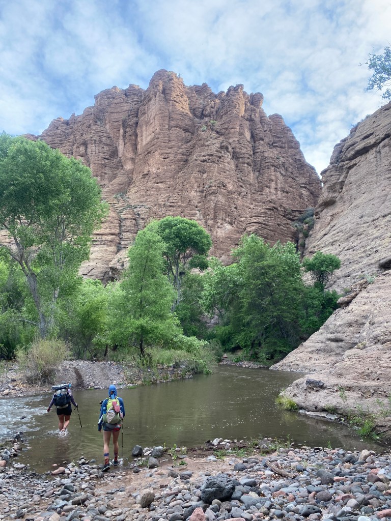 Bird led our descent, expertly picking out the best route between a mix of wash and intermittent trail. Three miles along, in the shade of cottonwoods, water from Smith Spring ran across muddy ground filled with cattle prints. Surprisingly, the water didn’t taste like cow. We each gathered some before continuing a mile to a trailhead. There was a brief road segment, in which we saw a wild burro! Then we arrived at Eagle Creek. I unzipped my lower pant legs and removed my gaiters. We forded the creek four times, the deepest one just over my knees. The water was a pleasant temperature and the current was mild. We set up camp in a pleasant spot, amongst mesquite trees.