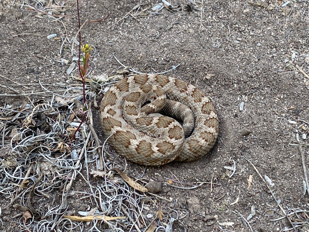 There were two fun critter encounters. Thorn spotted a snake after the rest of us either stepped over or walked around it without noticing. It was curled up tight with its head tucked under a coil. When Pops and I went back to check it out, it got nervous and slithered a short distance, lifting its head and raising its rattle. It was young, perhaps a little over a foot. I thought it was another Prairie Rattlesnake, however seek said that it was an Arizona Black Rattlesnake, which is the only Arizona snake species that can undergo morphological color change, like a chameleon. The other critters were a pair of butterflies mating on my arm.