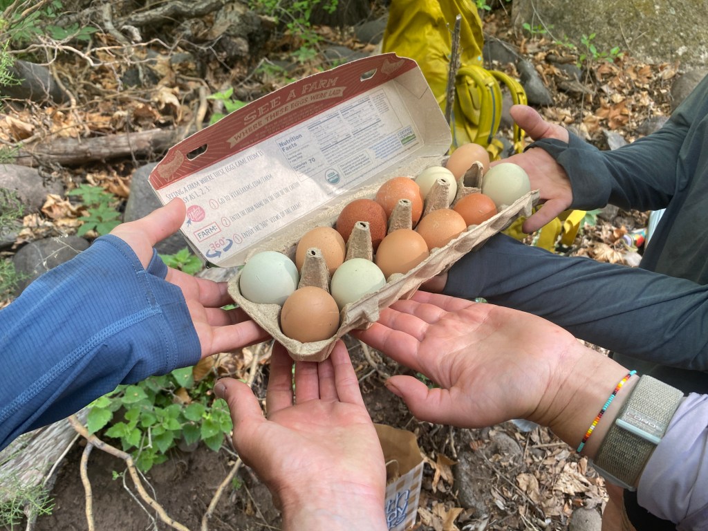 Yesterday, all of us ate through more food than we allotted for the day. At lunch, which we ate by the side of Juan Miller Road, I shared that I’d been dreaming of trail magic, so had Bird and Pops. Three miles later, we were gathering water at Turkey Creek, which crossed the road. A lady in a pickup stopped to check on us. She and her husband, who continued on in a second pickup, were off to round up wayward cows using horses and dogs. When Bird asked if she had any snacks, she drove back to her house and returned with a dozen fresh chicken eggs, a tin of salmon, four broth packets, and a few other items. This generous, sweet lady was named Kyle. Pops and I each gave her crystals that we found on the trail. It was a sweet moment and we happily planned what to do with our bounty of food.
