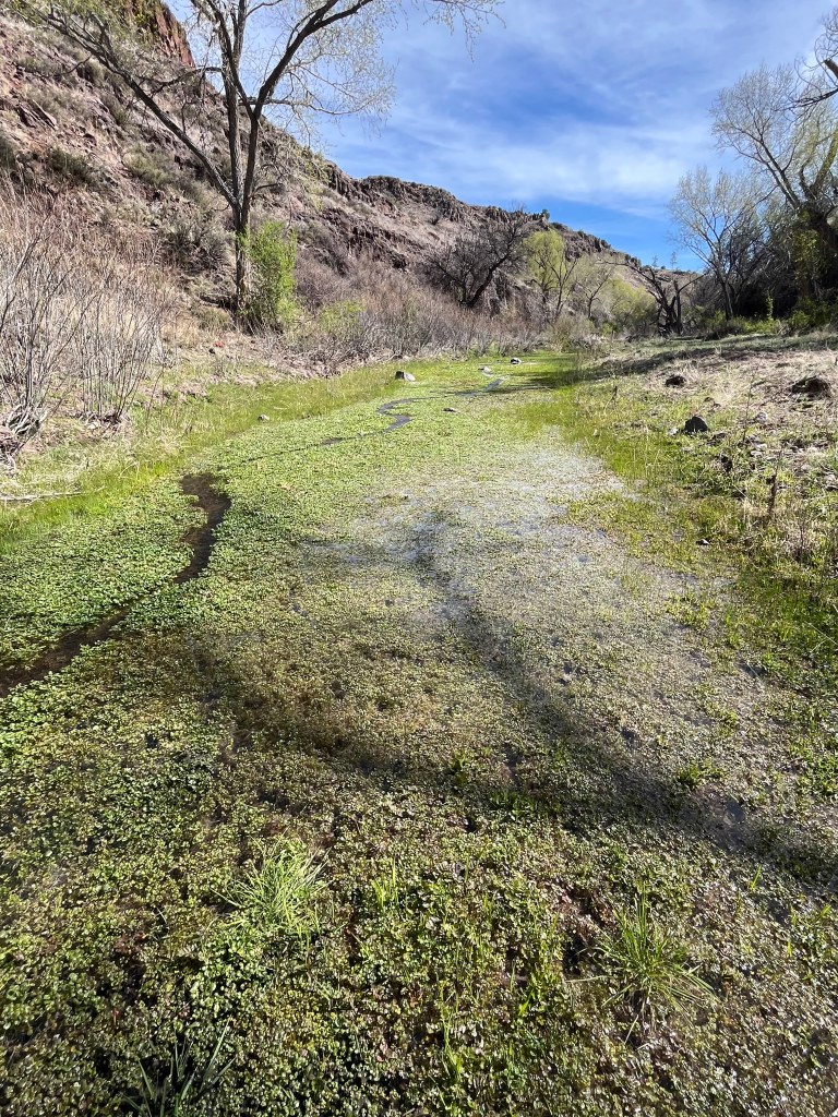 Scattered thunderstorms struck right as we got back on trail. I was again grateful for my umbrella. We ascended, walked a mesa, descended; then repeated all that with a higher ascent the second time. The rain was brief, yet came off and on. The second descent put us in Adobe Canyon. We took off our shoes to ford a single crossing of the East Fork Gila River. Directly after, we met Freya, another GET hiker (wow, three in two days!) going westbound to reach trail days. She told us the coming four miles were bushwhacky and that we were in the best spot to camp. We’d only done ~7 miles and it was early, 5:30 pm, but all of us thought an early evening sounded nice plus we had an extra 1.5 days of food apiece.