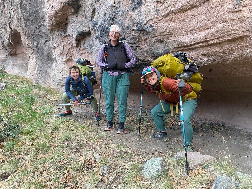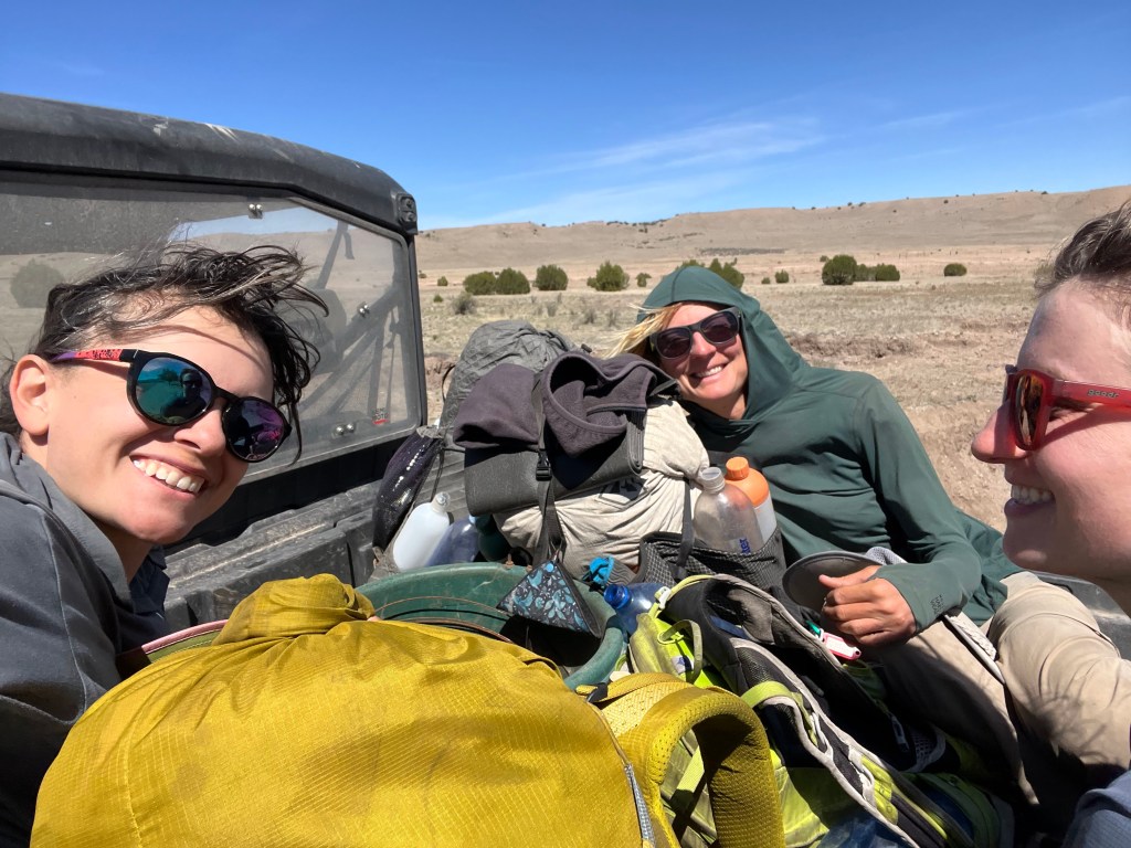 A 27 mile water carry meant varying amounts of water for each of us, from 4.8 for me up to 6.5 liters for Pop. It was hilarious watching her try to fit the water in her pack; Thorn laughed so hard. Pop has the tiniest pack of us all, volume wise. There’s always assorted gear hanging off the back, but she makes it work. It turns out her trail name is a derivation of Mary Poppins, based on her pulling unexpected items (like 3 pounds of cocoa) out of her pack on the CDT.