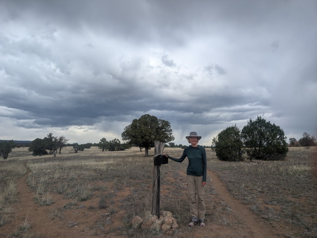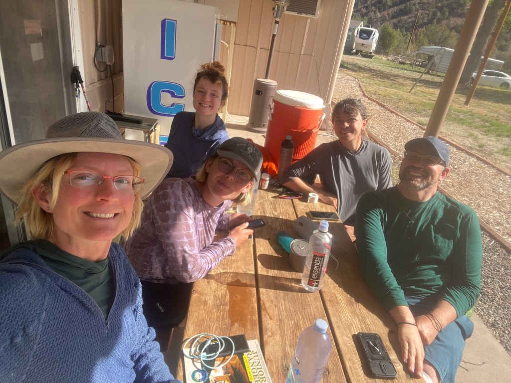 We hung around Doc’s long enough that we made lunch before we left. A lady driving by in her Sprinter van gave the four of us a ride back to the Gila Visitor Center. Ranger Shianne, the female ranger we met yesterday, had a fleece vest that she loaned Bird to replace her lost Alpha fleece. We also met Shane, another GET hiker. His water data was super helpful to us before Safford. It also turned out that Bird and Pop knew him. He gave them a ride from Silver City when they skipped a long paved road walk. Now we’re ahead of him because his parents were picking him up for a zero day.