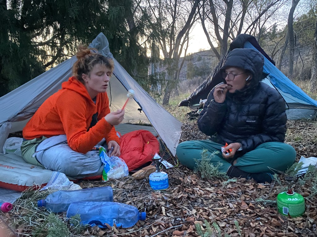 We made camp amongst short cottonwoods and on a bed of leaves. Similar to last night, we pitched out tents in a square with a common area at the center. My friends got s’mores fixings at Doc’s; I’d done my part by carrying the marshmallows in my pack’s mesh. I ate several marshmallows with pieces of a dark chocolate bar that I got from True Grit. It was fun watching Bird roast marshmallows on a tent stake over her camp stove burner. She made her s’mores with a Reeses cup while Pop and Thorn had typical ones. Afterwards, I heard a critter rustling in my tent vestibule and it turned out to be an adorable toad.