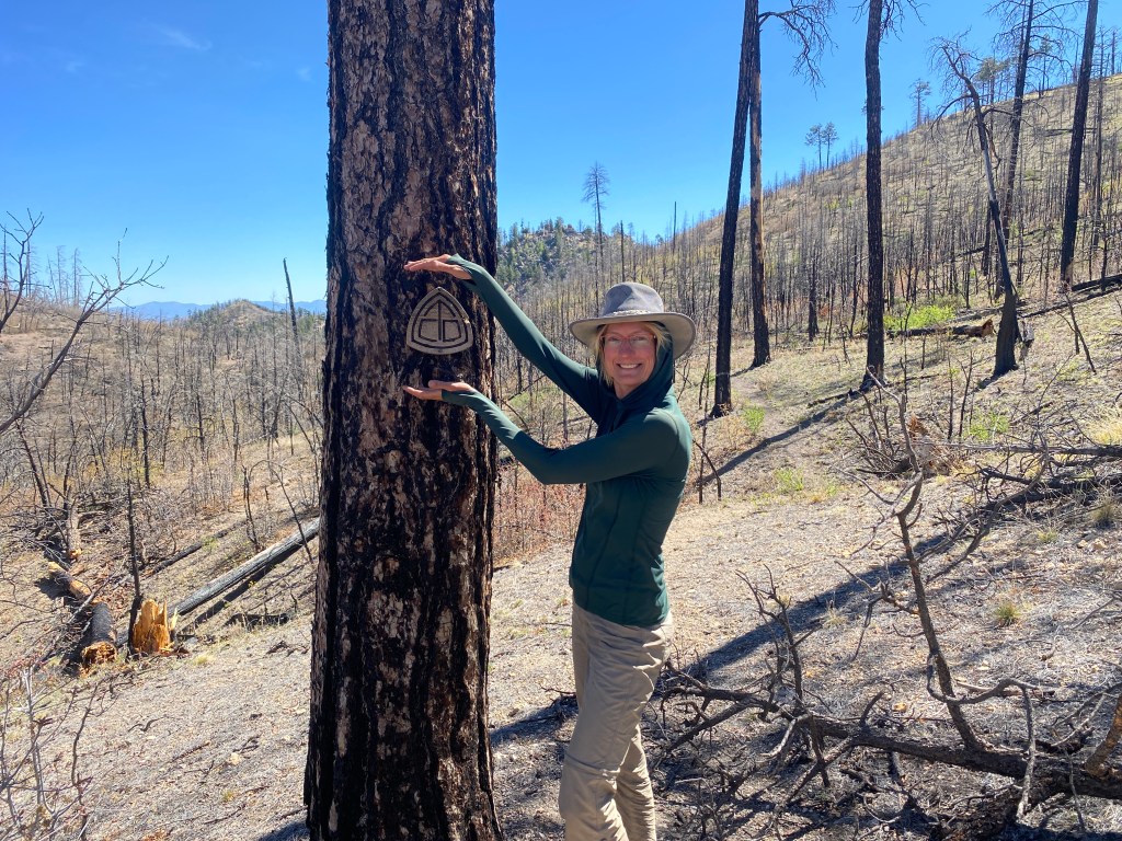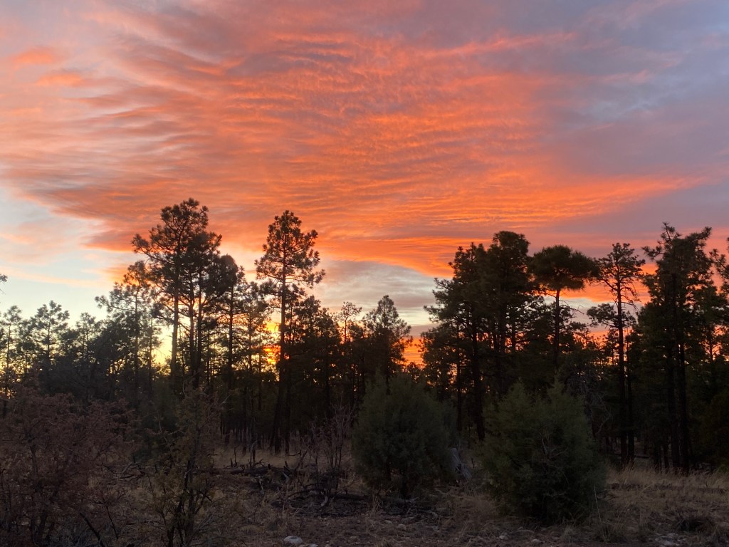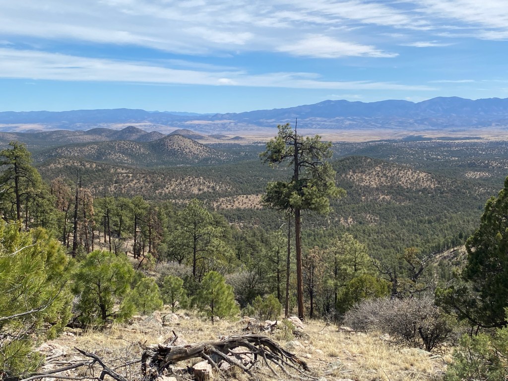 After lunch, Pop and Thorn napped while I journaled. Pop’s bottle toppled out of its gravity filter arrangement and I hurried to right it before too much of the water spilled into the soil. When Bird arrived, she had lunched at the road so we continued on into what was new territory for all of us. We hiked upward alongside a fence until we reached a high point adjacent to Wahoo Peak, fun name! Then we descended down along the same fence, treated to an impressive view of Black Mountain and the Apache Kid Wilderness.