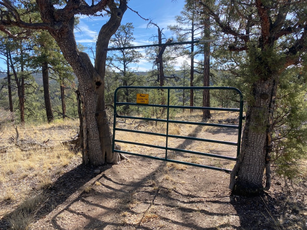 A wind blew all through the night and on into morning. Fortunately our site was also the recipient of early morning sunlight. We were up at 6 am and out of camp around 7:30. The CDT followed an old 2-track road, climbing gradually and passing through numerous gates, each one different. My favorite was one flanked by two alligator junipers. I smiled at a three gate junction that Top Shelf and I had admired together.