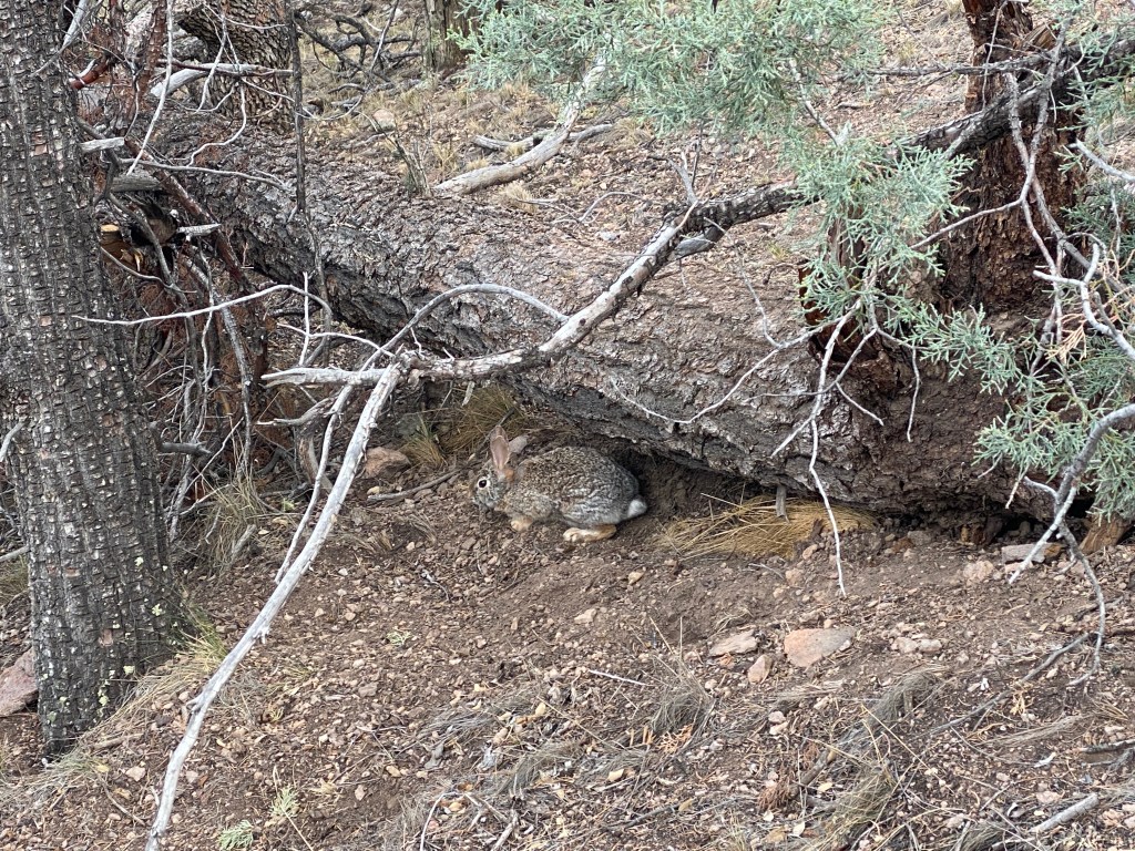 As the terrain flattened, the trail turned away from the fenceline to wrap around a knoll. I saw movement and backtracked a few steps to observe a cute bunny. We regrouped, crossed a fence, and proceeded cross country. Then we took a 2-track to a giant tire trough full of clear water. The wind pummeled us as we squeezed, all of our filters slowed by the last source. We got back on 2-track, yet quickly left it to search out a sheltered campsite. In a mostly flat area near the bottom of a drainage, we pitched our four tents around and between two juniper trees.