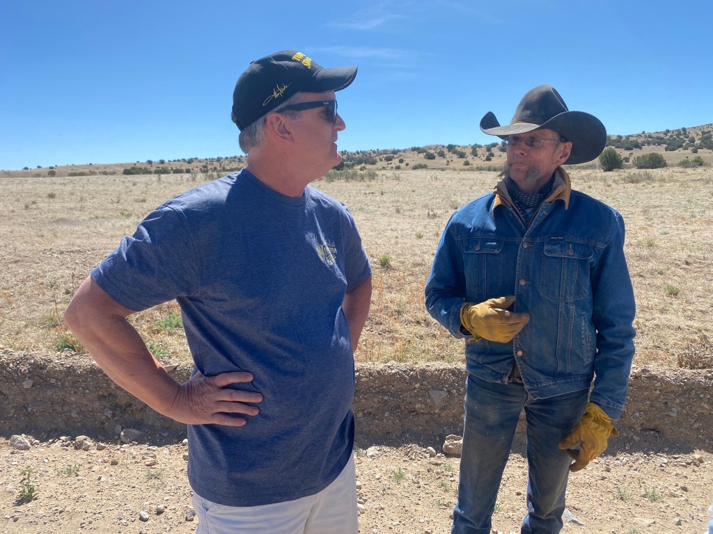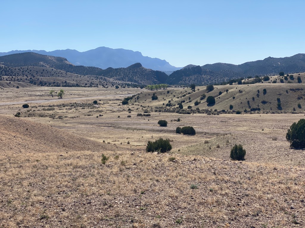 We reached NM 52, a dirt road highway, and – we soon realized – sparsely traveled. It was fine, we decided to walk towards Winston (18.5 miles south) and stick our thumbs out if we saw someone. After a half hour or so, we saw a white pickup headed north. We stuck our thumbs out anyway and the driver, Michael, stopped and chatted with us. Bird asked if he could at least drive us the eight miles to the NM 59 intersection, where we might find more traffic. He said no, complaining that the dirt road was hard on his pickup and already wishing he hadn’t driven it. Michael did give us each a water and shared a couple stories from his 5,000 mile road trip.