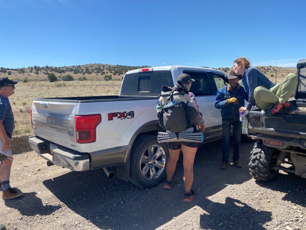 The four of us resumed our walk and had not gone far when a rancher, Bud, pulled up in a side-by-side with a flatbed. He was headed into town in the early afternoon and could take us if we didn’t mind waiting. First, he’d take us to his house south of our location. So Bird hopped into the front seat and Thorn, Pop, and I got in the back with our gear. Bud took off at top speed. Eventually, we saw that we were being gained on by a white pickup that looked like Michael’s truck. It was him and he waved Bud to stop. It turned out Michael had a change of heart; he said how often do you get such a clear chance to help people. So we transferred our gear and ourselves to the back of his pickup and he took us all the way to Winston. Bud said he could take us back from town later.